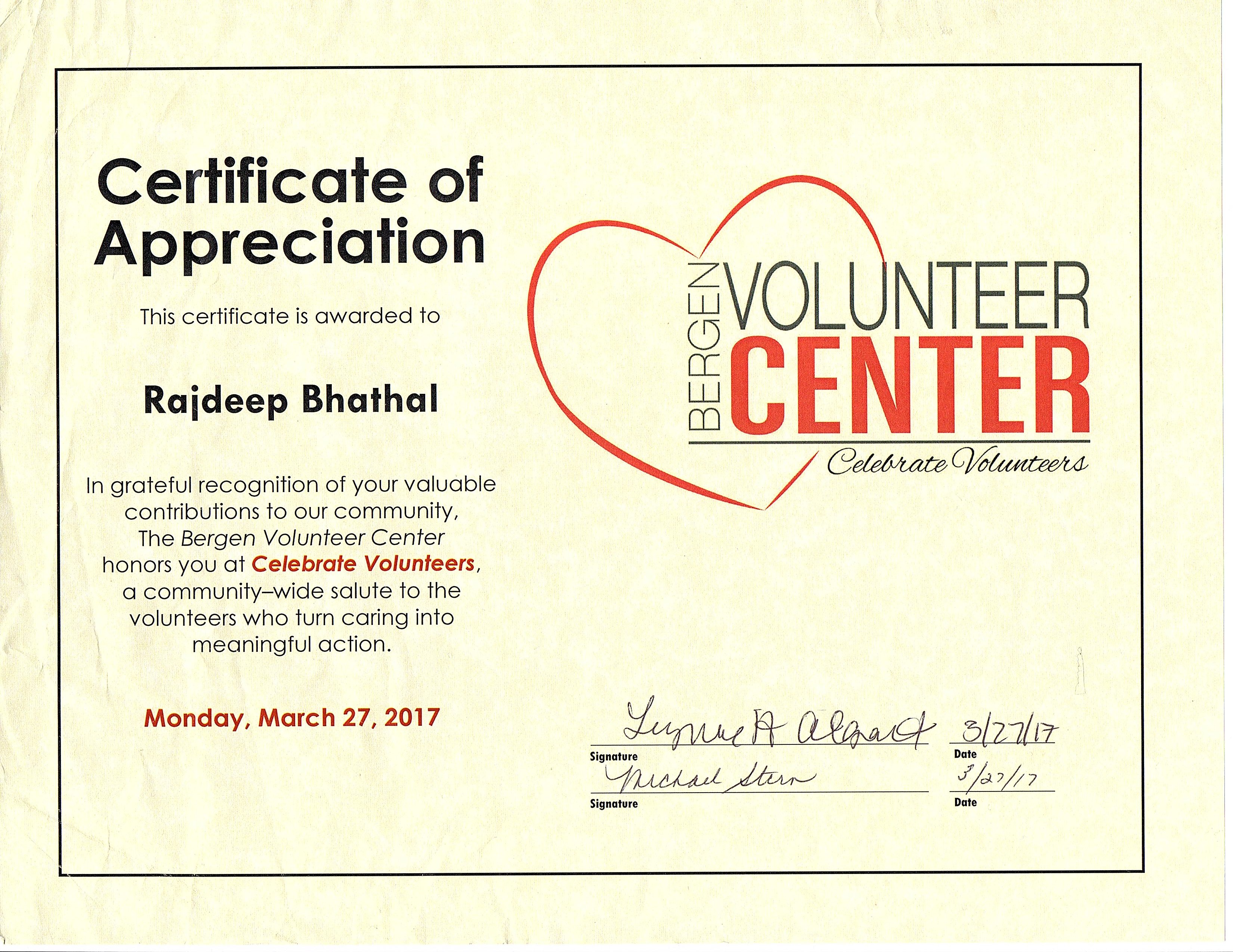 Bergen County Volunteers Appreciation Certificate
